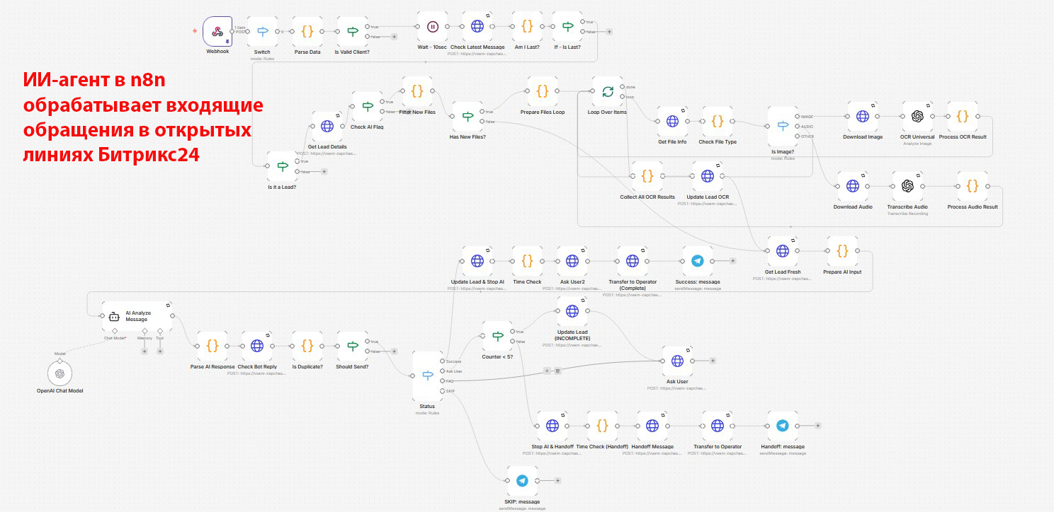 Я разработал архитектуру ИИ-агента на базе n8n, интегрировав нейросети напрямую в Открытые линии Битрикс24. Выбор Открытых линий принципиален: этот инструмент агрегирует абсолютно все каналы связи компании (Телеграм, Ватсап, Макс, Авито, чат на сайте). Благодаря этому один ИИ-агент централизованно обрабатывает весь входящий трафик, откуда бы ни написал клиент.