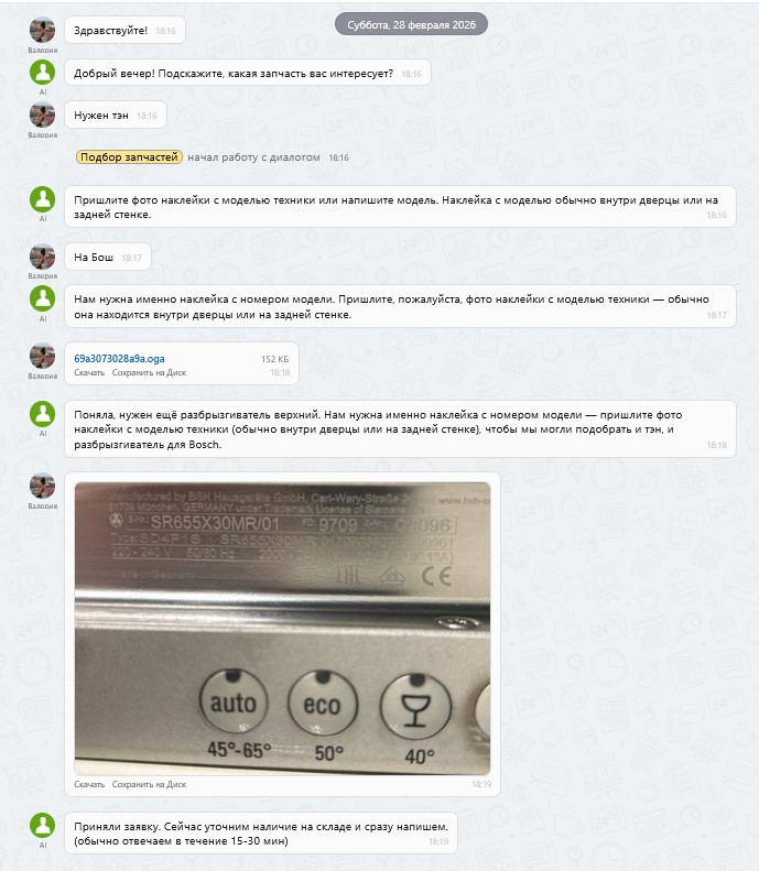 Суть решения в том, что бот ведет себя как опытный продавец запчастей. Когда клиент присылает голосовое сообщение или кидает фотографию наклейки (шильдика) от сломанной техники, ИИ мгновенно берет это в работу. Аудио транскрибируется в текст, а с фотографий вытягиваются нужные артикулы, бренды и модели.