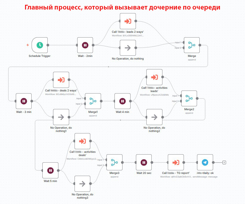 Техническая магия: всё работает на связке Битрикс24 + N8N. Под капотом у каждого отчёта 5 процессов, которыми управляет главный сценарий. Такая модульная архитектура делает систему стабильной: ежедневный отчет держит менеджеров в тонусе, а еженедельный страхует от потери клиентов и бардака в задачах.