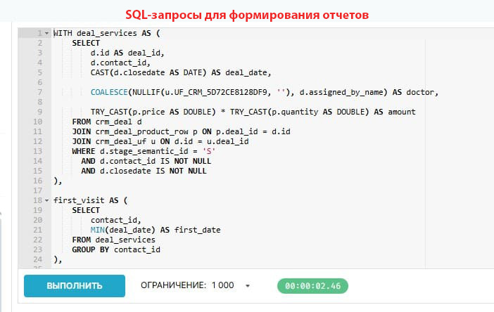 Я подключил BI-конструктор внутри Битрикс24 и настроил дашборд, который обновляется автоматически. Стандартные отчеты CRM не давали нужной глубины, поэтому я использовал специальные SQL-запросы к базе, чтобы вытащить данные с детализацией до конкретной услуги.