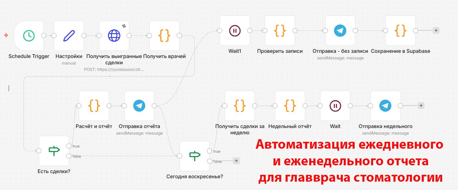 Я разработал двухуровневую архитектуру на базе n8n, которая связывает Битрикс24, базу данных и нейросеть. Вся информация приходит руководству напрямую в Телеграм.