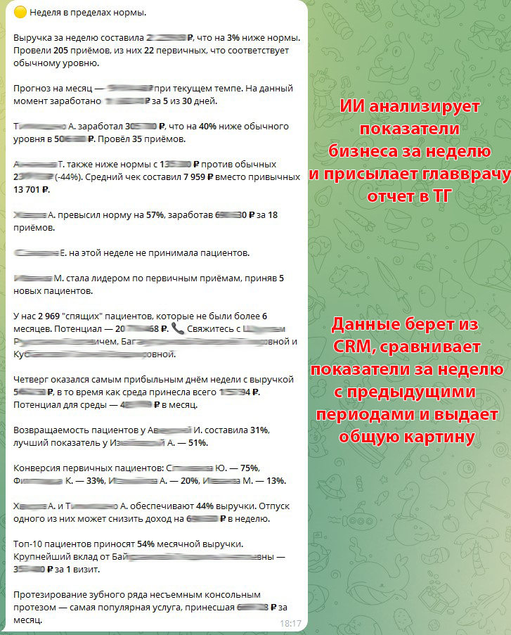 - Уровень 2. Еженедельная ИИ-аналитика. Алгоритм анализирует исторические данные за полгода. Он высчитывает норму для каждого врача и находит аномалии (например, выручка упала на 20%). Также система находит "спящих" пациентов с высоким чеком и недопроданные услуги. Эти цифры передаются в нейросеть, которая формирует связный текст с вердиктом по неделе и планом из 3 конкретных действий.