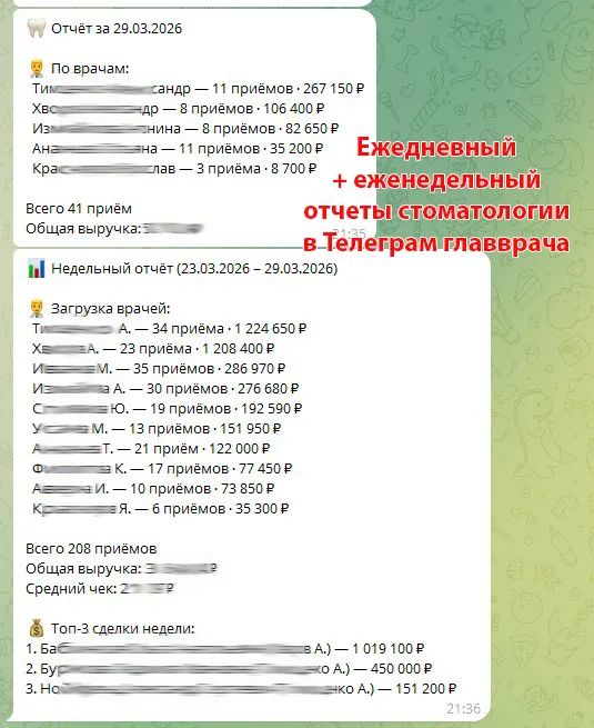 - Уровень 1. Ежедневный контроль. Каждый день в 21:30 алгоритм собирает данные по закрытым приемам. Он считает общую выручку, средний чек, количество первичных пациентов и выручку по каждому врачу. Главная фишка - система автоматически проверяет, кому из пациентов не назначили следующий визит, и сразу подсвечивает это в отчете.